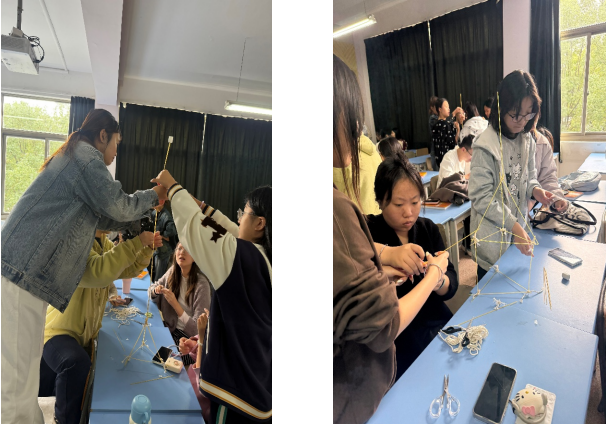 课堂现场气氛热烈,电商2441班的同学们展现了极高的参与热情。各小组迅速进入状态,有的在激烈讨论、绘制草图;有的则大胆动手,开始搭建原型。“小心!左边加固!”“我们的底座要更稳!”“时间不多了!”……课堂里充满了思想的碰撞与合作的火花。学校特邀的拍摄人员用镜头全程记录下了这些专注的面孔、创新的设计和成功的欢呼,这些珍贵的影像将成为专业建设与宣传的生动素材。