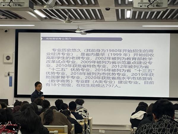 会上,赵毅主任围绕市场营销专业的就业岗位、优秀毕业生风采以及2025级人才培养方案,为新生进行了系统而深入的解读。他结合当前就业市场发展趋势,详细介绍了市场营销专业毕业生主要从事的市场类、销售类、客服类及电商运营类等岗位,特别指出在新媒体与数字化营销领域,如直播运营、用户增长、品牌策划等方向具有广阔前景。