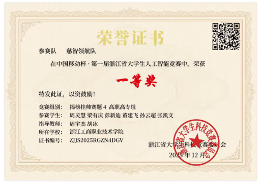 2025年11月28日至30日,“中国移动杯”第一届浙江省大学生人工智能竞赛顺利举行并圆满落幕。我校慈溪学院派出由学生梁有庆、周灵慧、彭新迪组成的参赛队伍,在周宇杰、胡冰老师的指导下,凭借其扎实的专业知识、卓越的创新能力和高效的团队协作,经过多轮激烈角逐,最终脱颖而出,荣获本次大赛一等奖,充分彰显了我院在人工智能领域人才培养方面的显著成效。