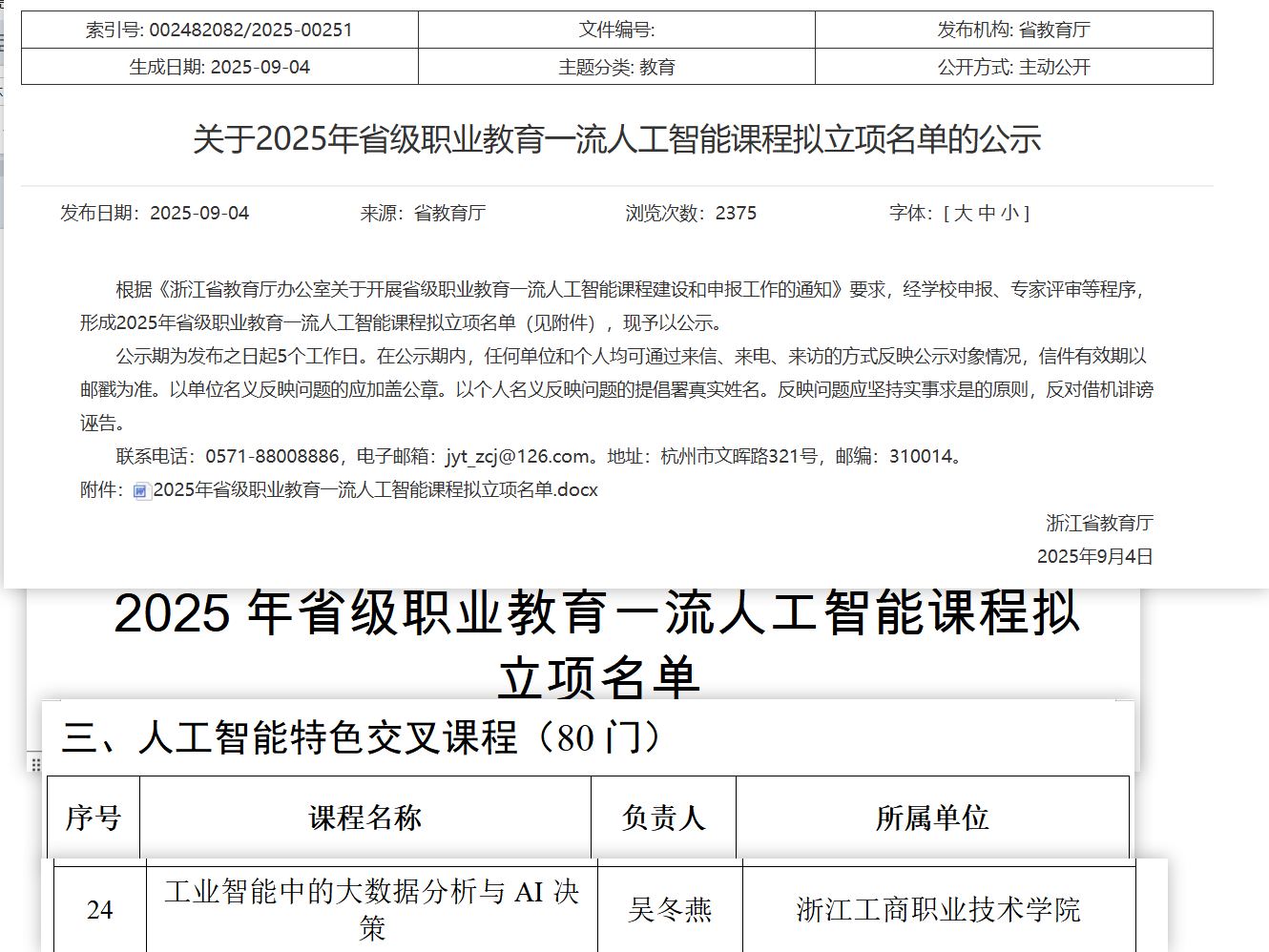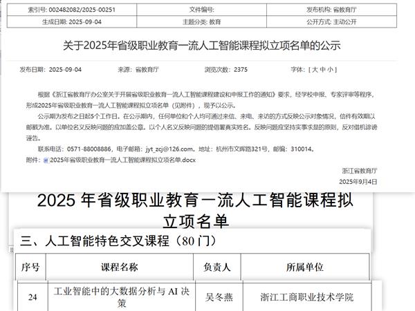 近日,浙江省教育厅公示了2025年省级职业教育一流人工智能课程拟立项名单,软件技术专业的《工业智能中的大数据分析与AI决策》课程成功入选“人工智能特色交叉课程”类别!这是软件技术专业在人工智能与工业应用交叉领域课程建设中的重大突破,也是对专业教学团队多年来深耕工业智能领域的充分肯定!