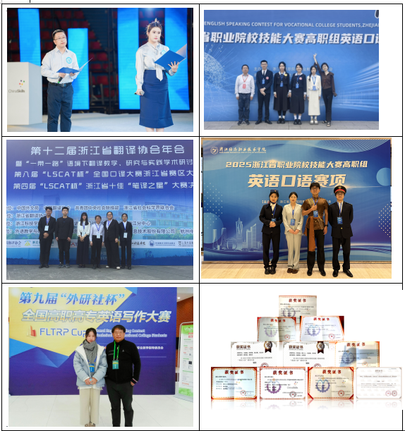 基于“三方联动、模块融合、工学结合”的高职应用英语高技能人才培养模式,2025届毕业生专升本上线率为87.43%,四级过级就给98%左右,六级过级率为60%左右。自2006年以来,专业指导学生获英语口语(A类)省赛国赛84个奖项,其中12名全省冠军,10名学生代表浙江省参加国赛,荣获国赛一等奖3项、二等奖6项、优胜奖1项。