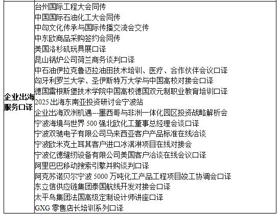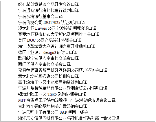 专业对外服务能力强,具有校级优秀翻译社会服务团队,专业教师在省内同行、区域产业中知名度高、权威性强,为区域外语外贸产业贡献鲜明。具有全省知名同传口译,交替口译师、浙江省批跨境电商师,亚马逊平台培训师。依托“中小企业外语外贸服务中心”平台,实现各类中高端会议口译425人次,各类大型展会志愿者翻译服务52场、各类书籍与资料翻译 85本、为跨境电商企业咨询培训服务5500人次、为外贸企业出海开展员工培训6326人次,开设跨境电商职业资格证书培训班,为企业推送各类资讯信息200多条。部分社会服务如下: